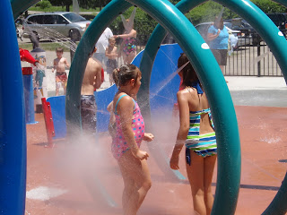 Yesterday, Katie and I took Sheila and her family to the new John Anderson Park Sprayground. It was my first encounter with a sprayground. It was fun and I wished I could have gotten in the water with the kids! The boys were not too sure of all it. I think they were hoping for a swimming pool instead. They did not care much for the water spraying or dumping on them!